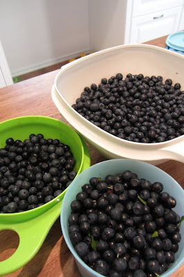 Små blå händer som ivrigt plockar så mycket de glupska munnarna rymmer och byttorna som fylls med stora goda bär, det är en idyllisk avslutning på dagen det. Bärplockning är faktiskt ett riktigt skönt sätt att bara umgås på och vilken belöning man sedan får då man sitter där med skålen med årets första blåbär med socker och mjölk framför sig. Imorgon skall vi äta ännu mera och så tror jag bestämt att jag skall testa den här blåbärspajen (tur att jag köpte vaniljglass trots att det kanske inte riktigt rymdes i budgeten egentligen). Ett par liter bär fryste jag ner men nog skulle vi ha användning för mycket mera.